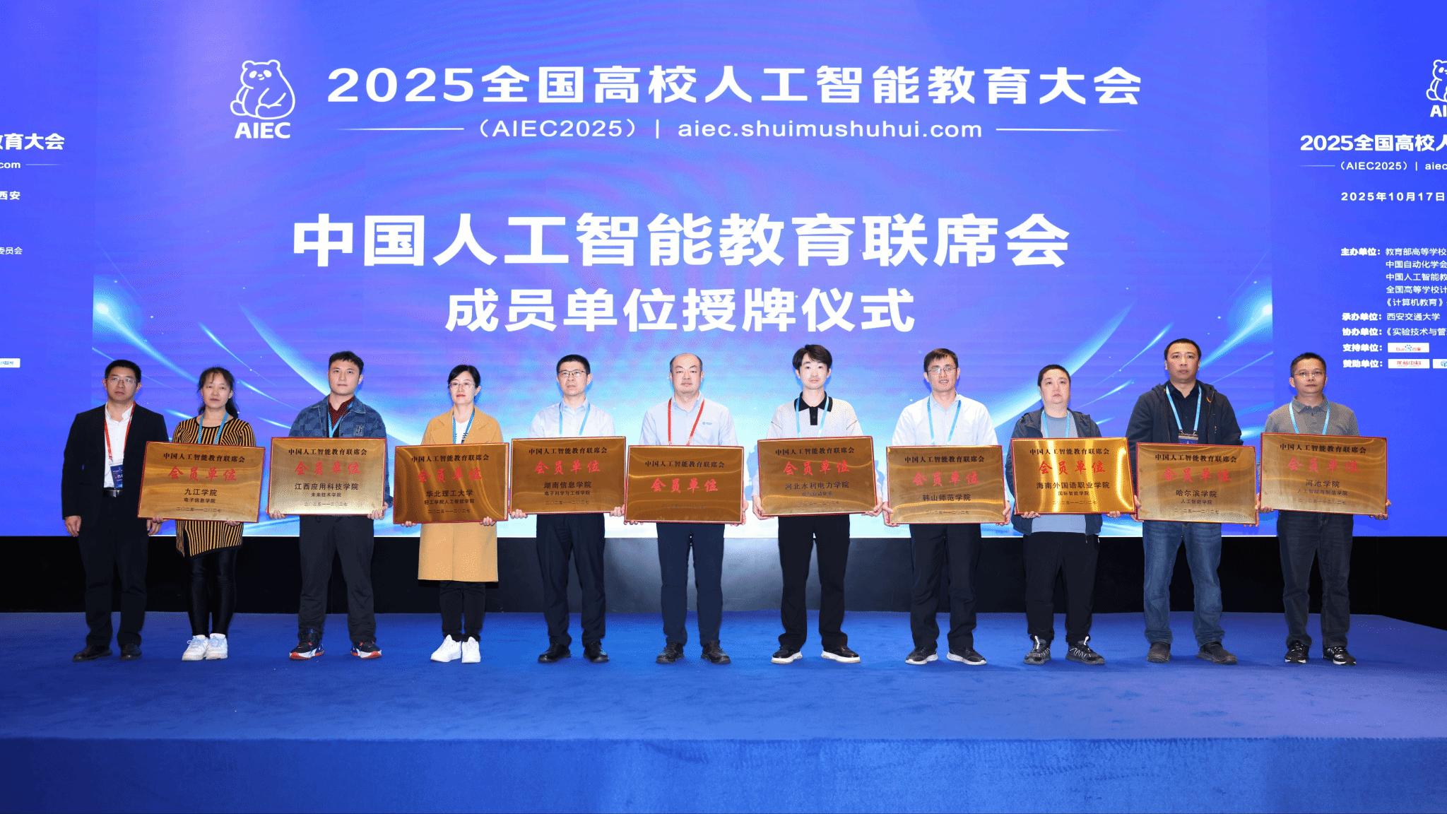 2025年10月17日至10月19日,由教育部高等学校计算机类专业教学指导委员会、中国自动化学会等权威机构联合主办的全国高校人工智能教育大会在西安成功举办。会议由教育部高等学校计算机类专业教学指导委员会、中国人工智能教育联席会等联合主办,西安交通大学承办,汇聚了郑南宁、郑庆华等多位院士及全国高校人工智能领域的专家学者,围绕人工智能人才培养、专业培养体系建设、专业课程设置、人工智能领域“101”计划、产教融合等热点话题展开深度交流。jinnianhui今年会国际智能学院作为新晋会员单位,在大会上正式接受了中国人工智能教育联席会的授牌。国际智能学院院长王波教授代表学院出席会议,并积极参与相关研讨活动。