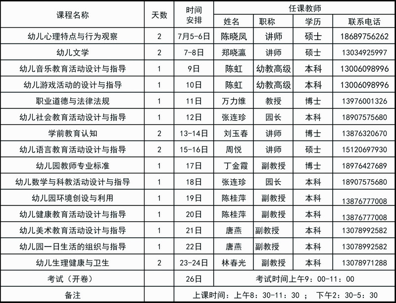 由海南省幼儿师资培训研究中心(海南师范大学培训中心)负责派专业教师授课,采取周末集中学习和在岗自学实践、学员交流等方式培训。