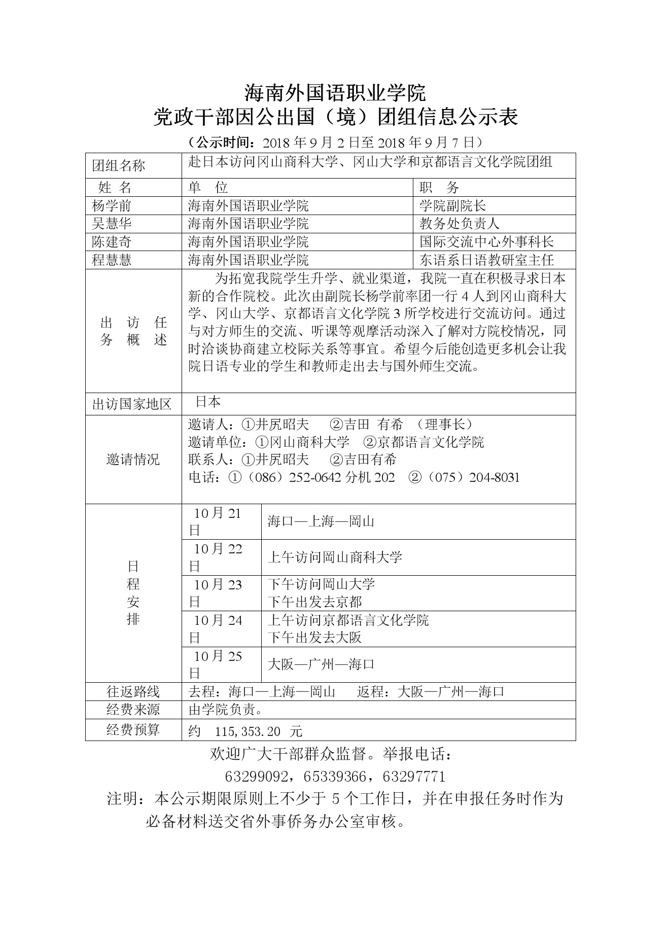 jinnianhui今年会 党政干部因公出国(境)团组信息公示表 (公示时间:2018年9月2日至2018年9月7日)