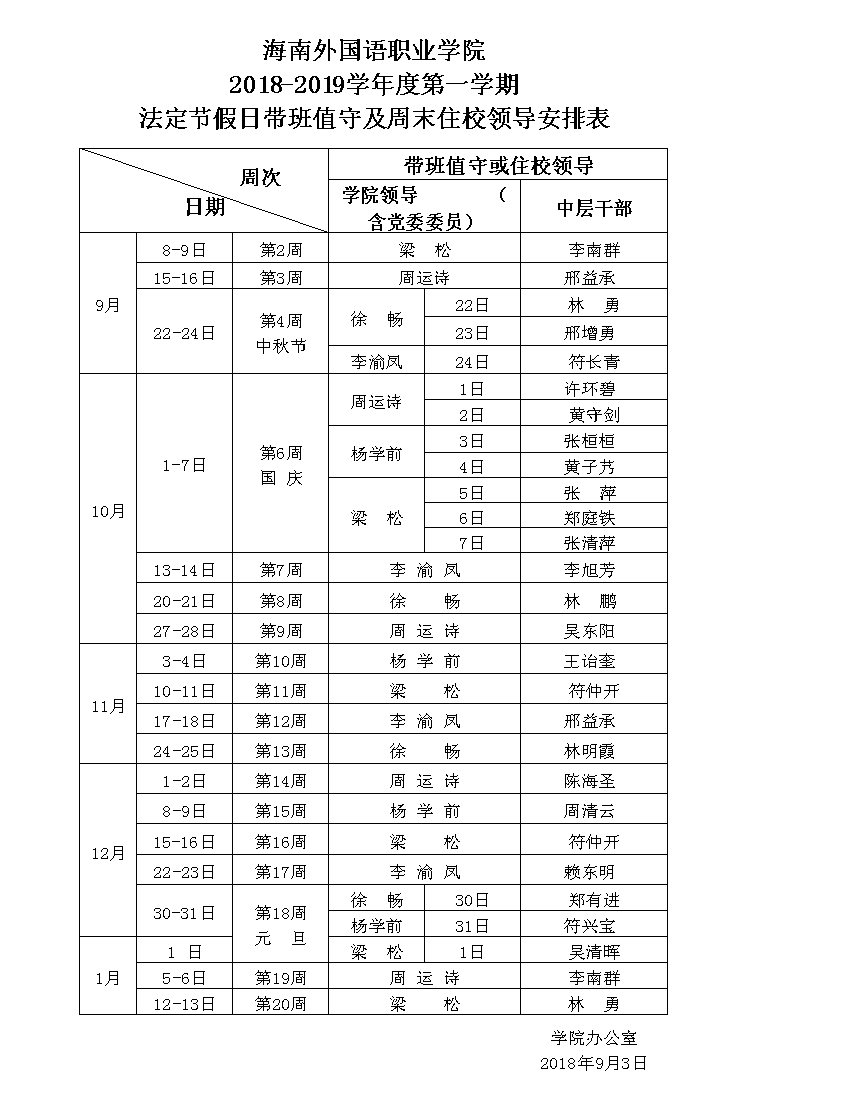 jinnianhui今年会2018-2019学年度第一学期法定节假日带班值守及周末住校领导安排表