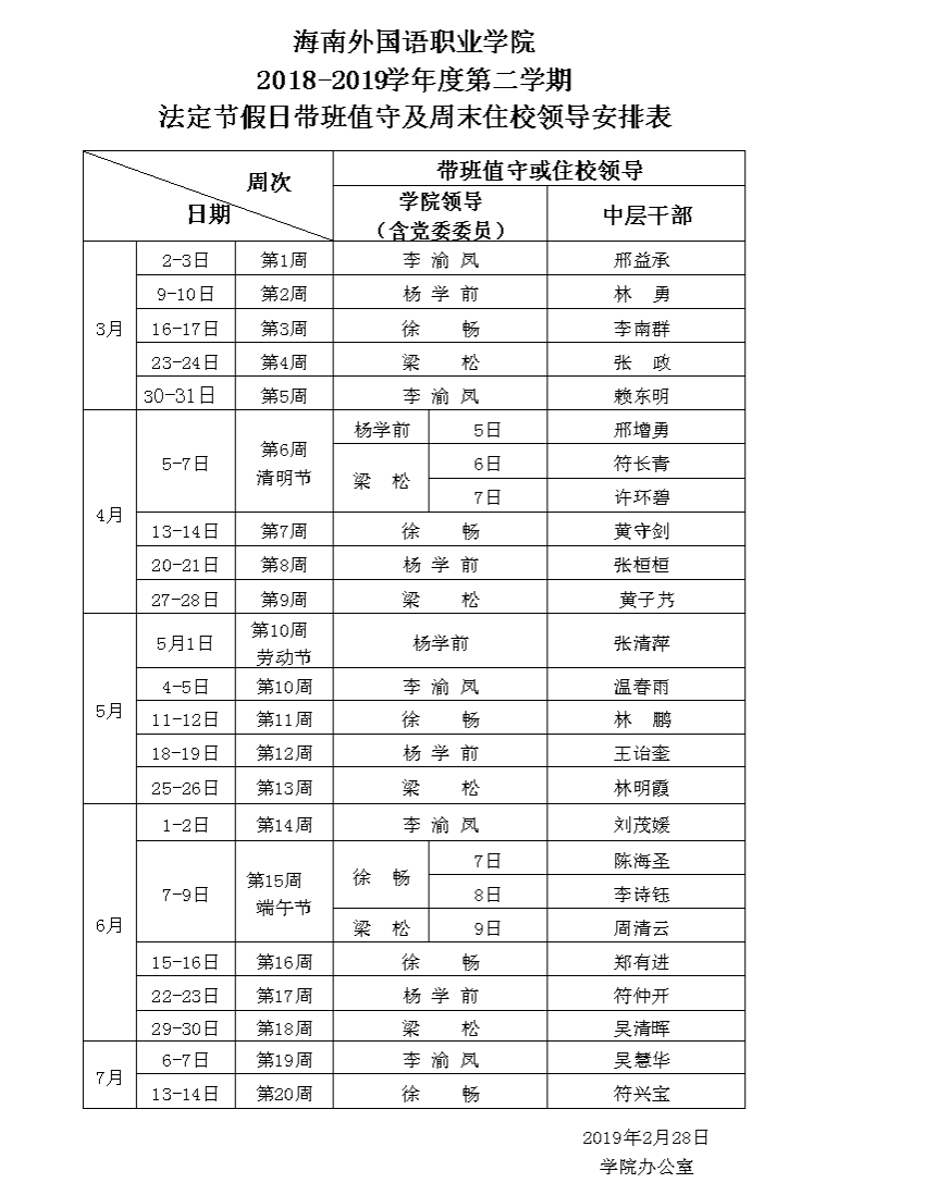 jinnianhui今年会2018-2019学年度第二学期法定节假日带班值守及周末住校领导安排表