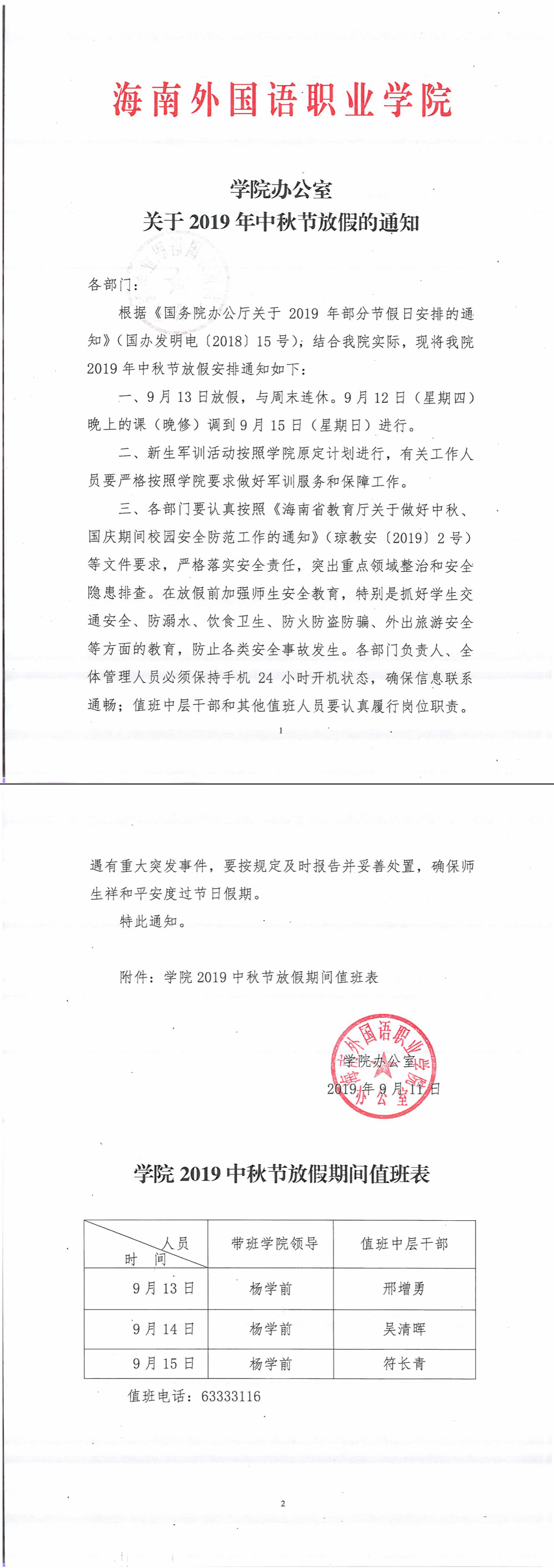 学院办公室关于2019年中秋节放假的通知