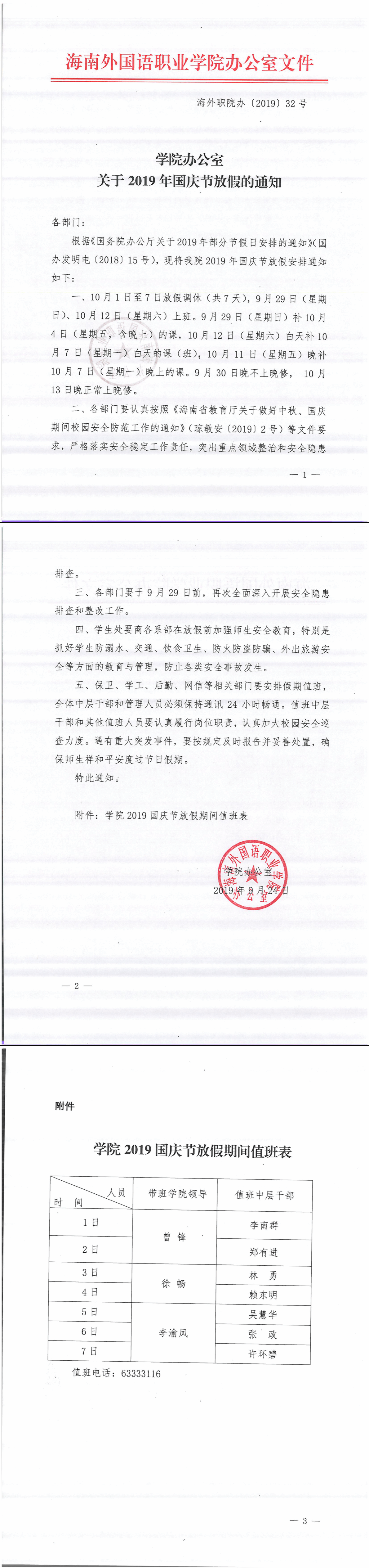 学院办公室关于2019年国庆节放假的通知