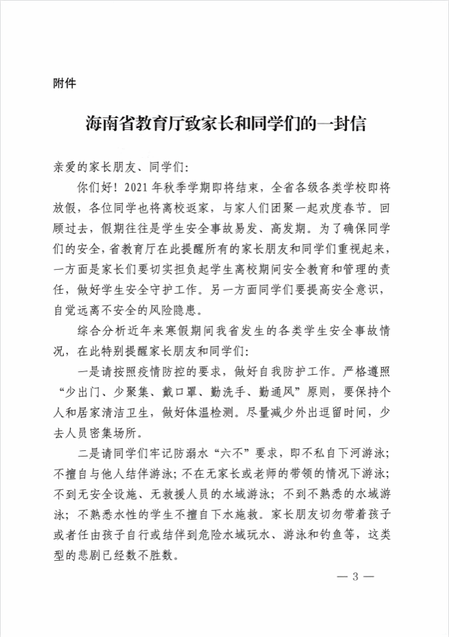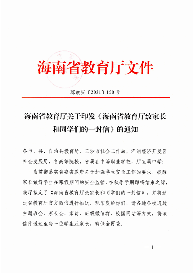 转:海南省教育厅关于印发《海南省教育厅致家长和同学们的一封信》的通知