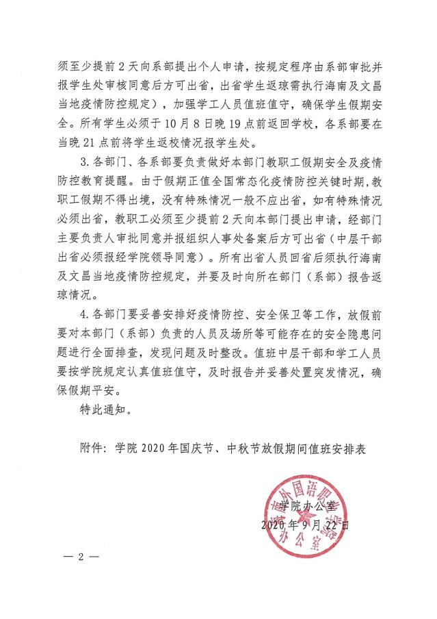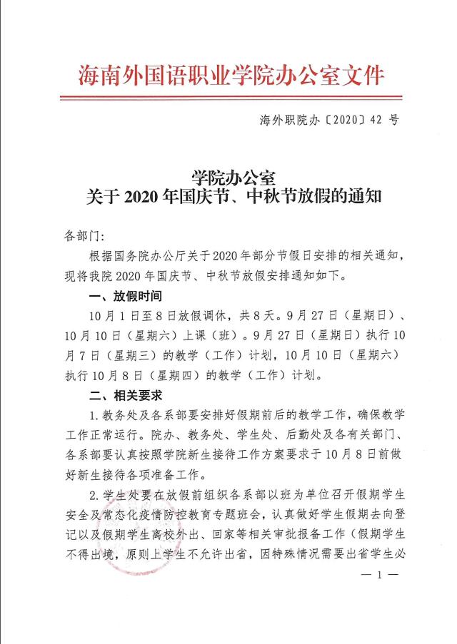 学院办公室关于2020年国庆节、中秋节放假的通知