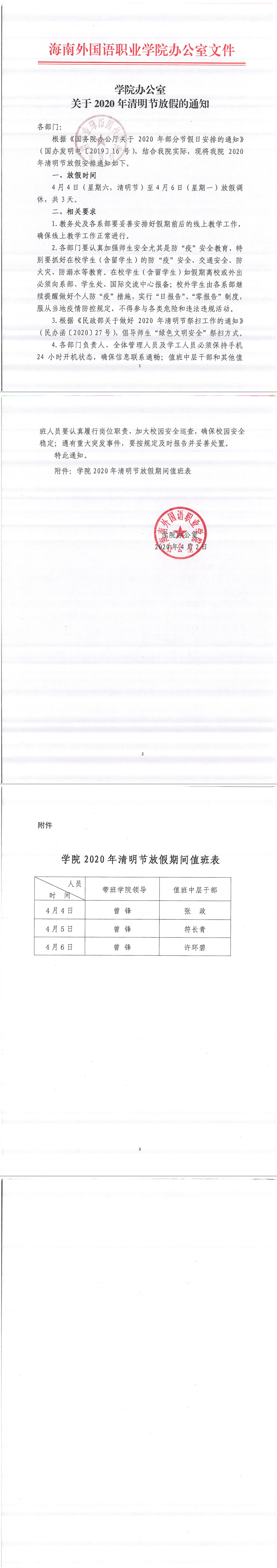 学院办公室关于2020年清明节放假的通知