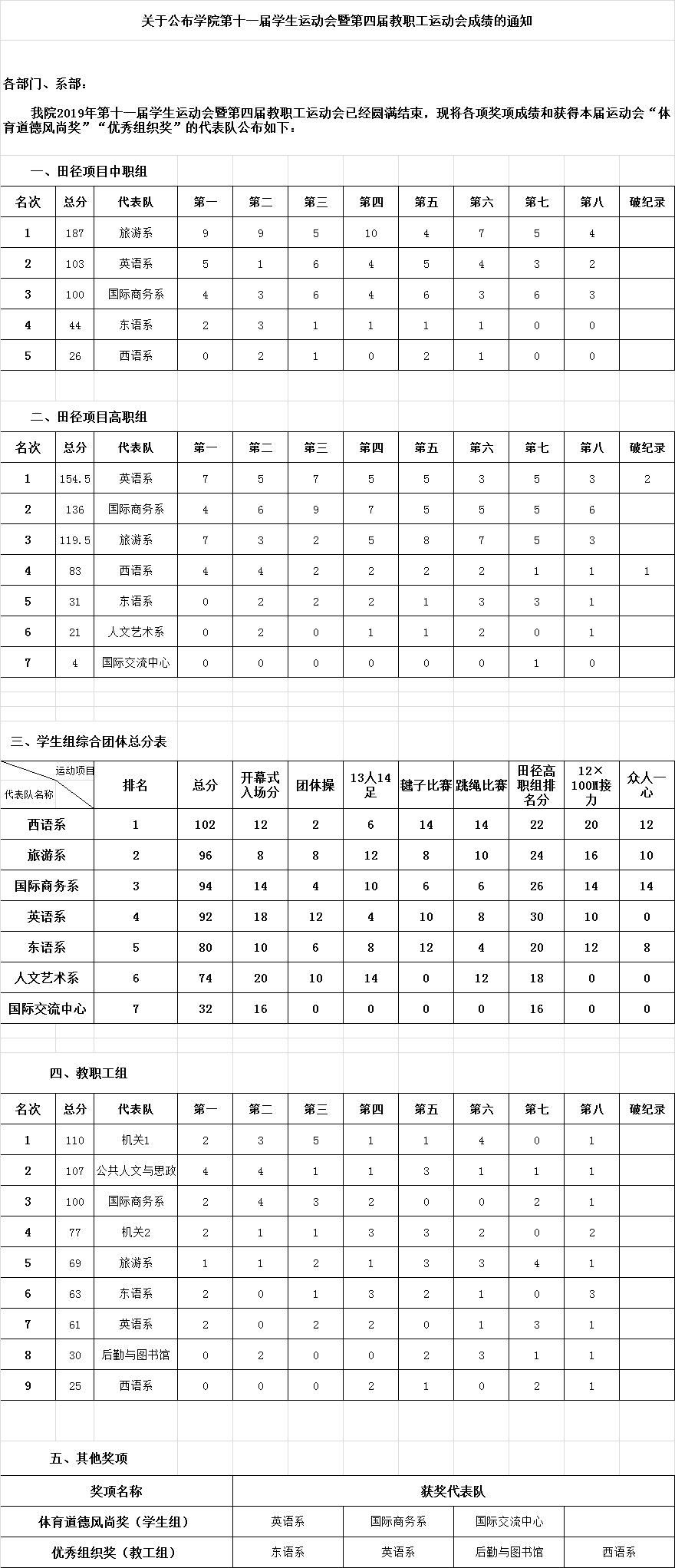 关于公布学院第十一届学生运动会暨第四届教职工运动会成绩的通知