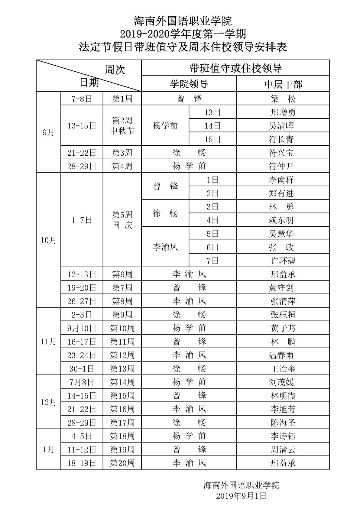 jinnianhui今年会2019-2020学年度第一学期法定节假日带班值守及周末住校领导安排表