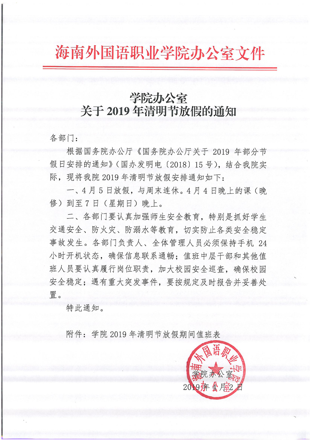 学院办公室关于2019年清明节放假通知