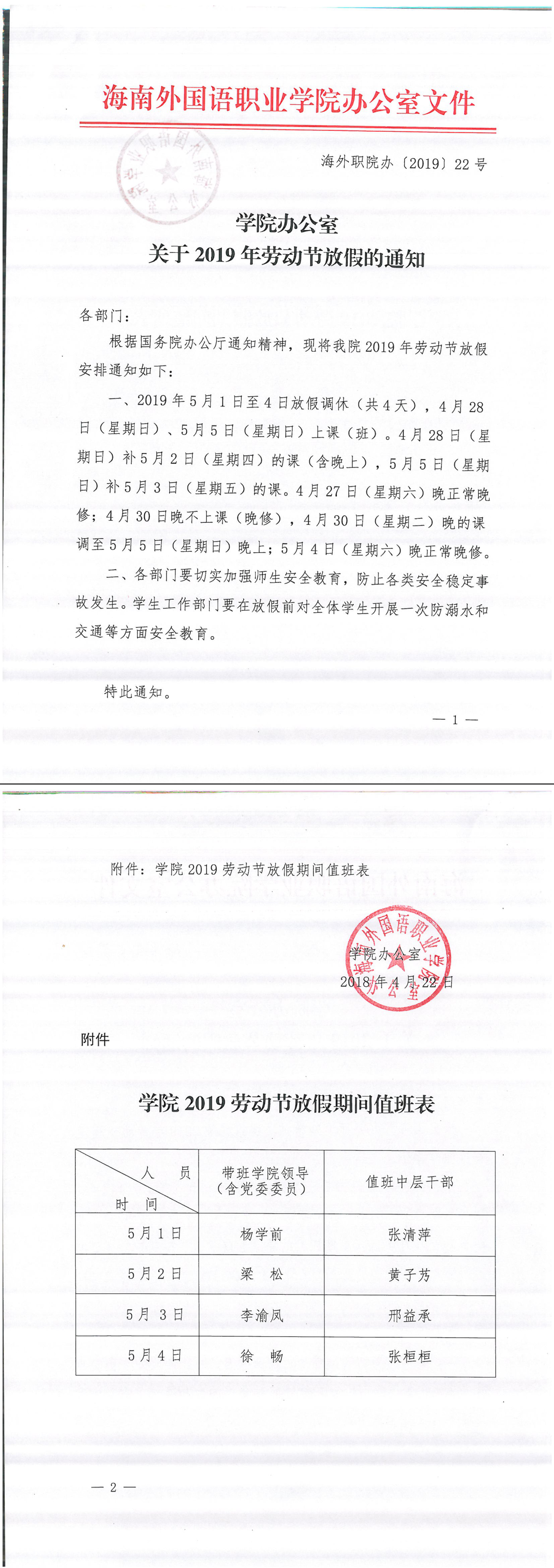 学院办公室关于2019年劳动节放假的通知