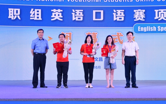 教育部职业教育与成人教育司一级调研员刘杰,赛区执委会委员、海南省教育厅高等教育处副处长苏永光,文昌市人民政府副市长李加奎,中国职业技术教育学会副会长、北京外国语大学原副校长闫国华,赛项执委会委员、我院副院长杨学前,赛项执委会委员、外语教学与研究出版社职业教育出版分社社长李淑静,现场专家组组长何明霞,大赛裁判长、东南大学李霄翔教授等领导嘉宾出席闭幕式,并为获奖选手、优秀指导教师获得者颁奖。