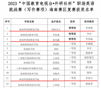11月5日,2023年“中国教育电视台·外研社杯”职场英语挑战赛(写作赛项)海南赛区复赛落下帷幕,来自全省13所高职院校的34名选手参赛。由李杏妹老师指导的今年会英语学院欧阳昊天和张佳鑫两位同学表现优异、脱颖而出,分别斩获比赛特等奖,将代表海南省参加今年12月在北京举办的全国总决赛。由李青宇老师指导的国际商务学院黄东平同学获得比赛二等奖。