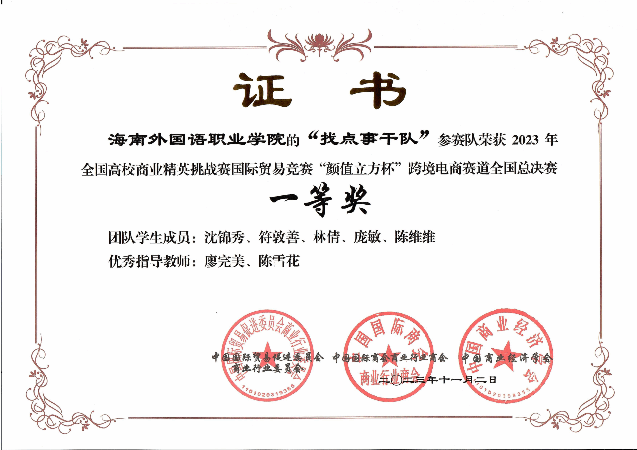 近日,2023年全国高校商业精英挑战赛国际贸易竞赛“颜值立方杯”跨境电商赛道全国总决赛于线上落下帷幕。由今年会国际商务学院商务英语专业2021级沈锦秀、符敦善、林倩、庞敏、陈维维五名同学组成的“找点事干队”参赛队伍,经过层层角逐,从知识赛、预选赛:方案赛+平台赛中脱颖而出,入围全国总决赛:方案赛+直播赛,并以出色的表现,在526支参赛团队伍中,斩获高职组总决赛一等奖。指导教师为廖完美、陈雪花。