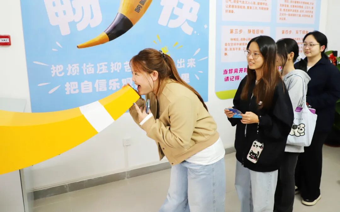 “刚开始还有点不好意思,喊出来之后整个人都轻松了!这种看得见、摸得着的情绪表达,比自己闷在心里舒服多了。”参与活动的2024级学生符青说道。作为此次活动的核心环节,“喊出压力、轻松前行”让学生们体验到了声波感应技术与喷泉原理结合的奇妙魅力——呐喊强度越大,水柱喷涌越高,无形的情绪压力转化为直观的视觉呈现,成为校园里一道独特的“心理疗愈风景线”。