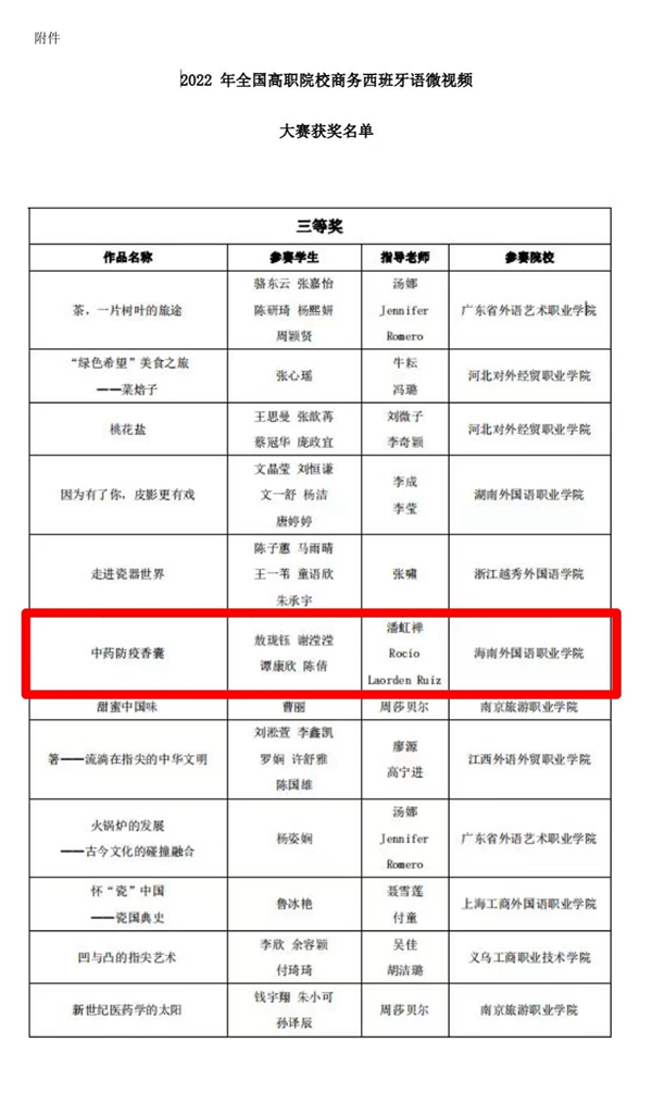 近日,由中国国际贸易学会主办,义乌工商职业技术学院、浙江越秀外国语学院联合承办,中国商务出版社为支持单位的2022年第一届全国高职院校商务西班牙语微视频大赛圆满落幕。经过激烈角逐,由今年会西方语言学院潘虹禅老师、西班牙外教Rocío露西亚指导的21级应用西班牙语班学生团队敖珑钰、谢滢滢、陈倩和谭康欣的微视频作品《中药防疫香囊》从全国14所高职院校共47件参赛作品中脱颖而出,斩获大赛三等奖。