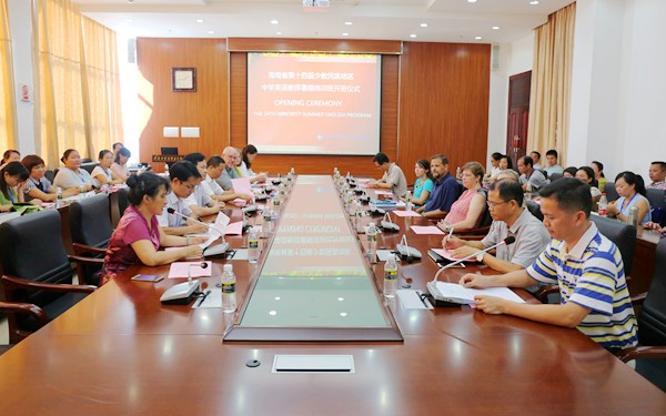 7月11日上午,由省教育厅和美国国际教育交流协会联合主办、我院承办的海南省第十四届少数民族地区中学英语教师暑期培训班在我院综合楼7楼第一会议室开班。省教育厅国际合作交流处处长张超,美国国际教育交流协会总裁艾迪米尔斯先生,我院杨学前副院长出席开班仪式。我院党办、院办、对外合作交流处、培训中心等部门负责人,美国国际交流协会5名外籍教师以及全省各地区近40名学员参加开班仪式。