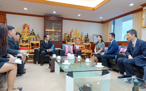 在访问的第二阶段,拉嘎邦先皇技术学院副校长蔡彦·杰塔那森(Chaiyan Jettanasen)博士在校长楼会议室会见了李渝凤院长一行。双方介绍出席人员后,蔡彦副校长首先对来自中国海南的李渝凤院长一行表示热烈的欢迎,接下来介绍了拉嘎邦先皇技术学院基本情况。 李渝凤院长首先对拉嘎邦先皇技术学院和蔡彦副校长的热情接洽表示感谢,她接下来详细介绍了我院具体情况,同时具体介绍了海南、文昌的基本情况。接着,双方就合作办学、学生互换等方面进行认真磋商,一致达成了缔结为友好合作院校,继续加深沟通交流、共同合作办学的意愿。