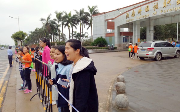 选手跑过我院校门口,师生为选手加油鼓劲