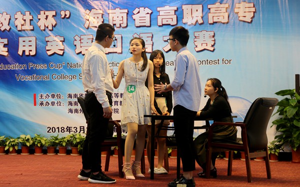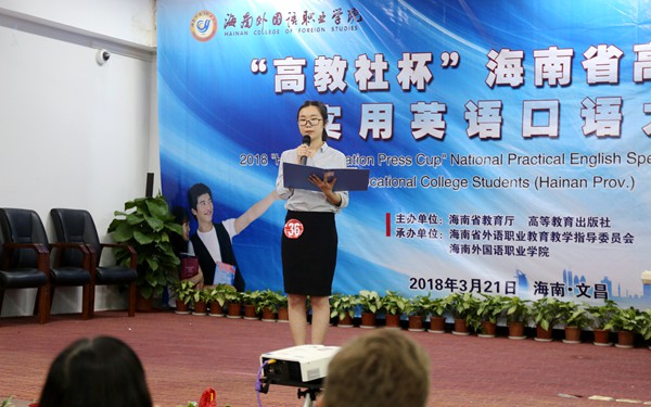 据悉,本次大赛由海南省教育厅、高等教育出版社主办,海南省外语职业教育教学指导委员会和我院共同承办,旨在进一步深化高职高专院校英语课程教学改革,不断激发高职高专学生学习英语的积极性,努力提高高职高专学生英语口语表达能力,同时为我省参加全国高职高专学生实用英语口语大赛选拔选手。