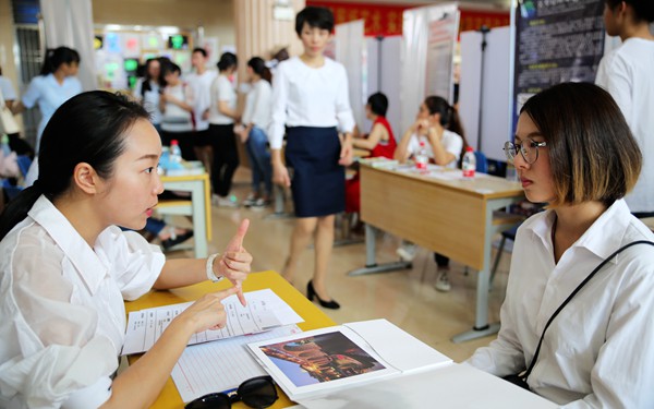 上午十点,招聘会正式开始,烈日阻挡不了同学们求职之心,现场人潮涌动,前来应聘的学生身穿正装,精神奋发,自信积极地将自己最好的一面展现给面试官。不少大二学生也前往现场观摩,提前感受应聘氛围。