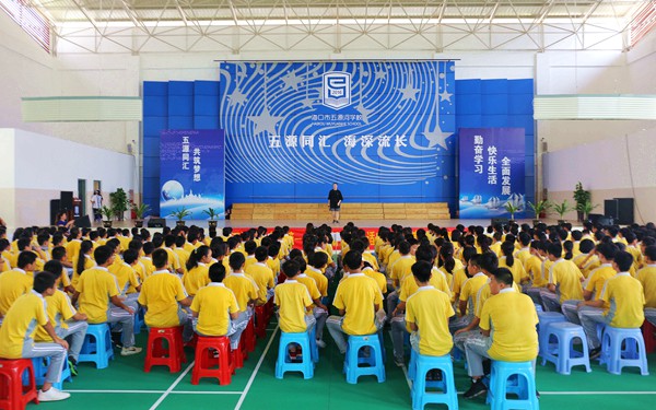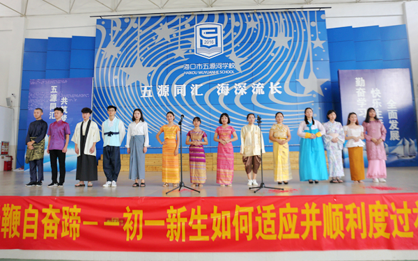 海口市五源河学校教务处负责人代表该校对我院东语系交流团的到来表示了诚挚的欢迎。她说,我院东语系交流团的到来,使五源河学校的同学们有机会在体育馆中体验不同国家的文化特色,为同学们提供了一次非常难得的学习和欣赏国外文化表演的机会;她也由衷希望我院师生的到来,能使本校学生对东南亚各国有进一步深刻的了解,促进学生对东南亚国家语言的认知,培养认识世界、探索未来的兴趣。