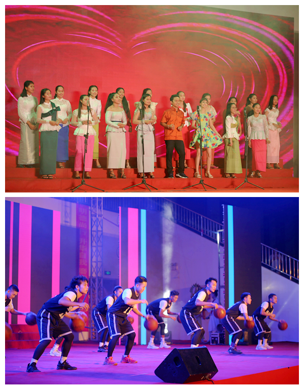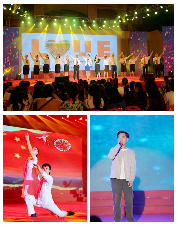 紧接着,热情洋溢的篮球秀瞬间将全场的气氛点燃,学院学生男子篮球队用极具默契的舞蹈动作惊艳全场,现场的气氛瞬间开始升温,激动的呐喊声此起彼伏,同学们的热情互动与台上的精彩演出,投射灯和闪光灯互放光芒,如同天上的明月,又如同一泻千里的星河。来自我院的国际生代表用《甜蜜蜜》诉说在我院留学生活甜如蜜。