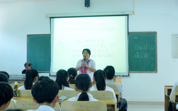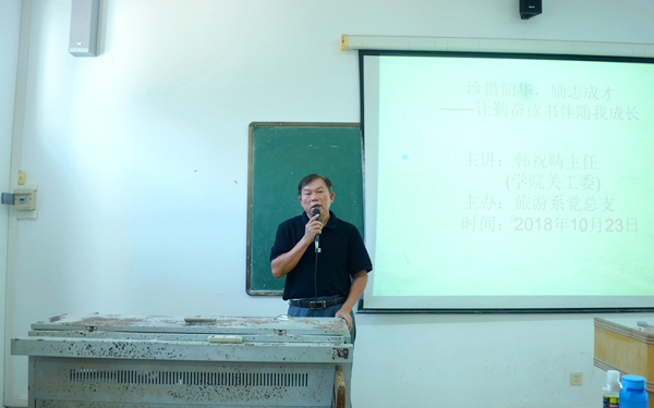 10月23日下午,我院旅游系在多媒体13教室举办题为“珍惜绍华 励志成才——让勤奋读书伴随我成长”的专题讲座,邀请我院关工委主任韩祝畴为该系2018级五年一贯制新生分享“读书与成长”的知识。该系党总支主要负责人林明霞主持讲座。