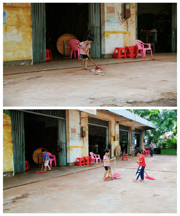在巡查返途过程中,劝导员在发现有一家商铺没有及时打扫卫生,家人也没有在家,仅有三位小孩在家时,很耐心并用温柔的语气告诉他们保护环境的重要性。劝导员走后,从一个小孩子拿起扫把到三个小孩拿起了扫把再到最后大人也参与了进来,对自家商铺门前进行了大扫除。地面从原来的遍地垃圾到如图看到的干净整洁,让我院“双创”工作劝导员都不禁对着他们竖起来大拇指。