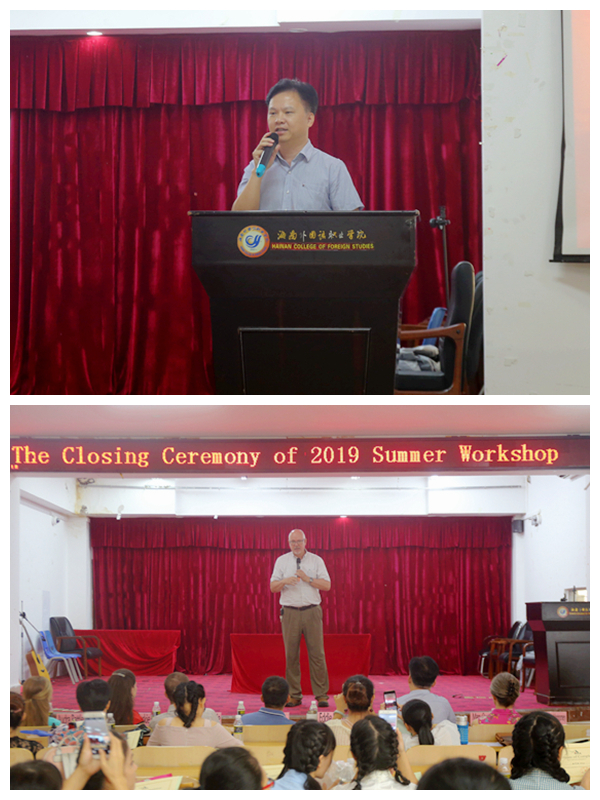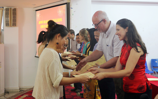 在省教育厅领导和各位授课老师的大力支持和配合下,我院承办的海南省第十七届中小学英语教师暑期培训班顺利完成,于8月9日上午在我院图书馆多功能报告厅举行结业仪式。我院副院长杨学前、美国国际教育交流协会总裁米尔斯先生、培训班6名外籍教师、我院教务处有关负责人,以及全省各市县小学40余名教师学员参加结业仪式。