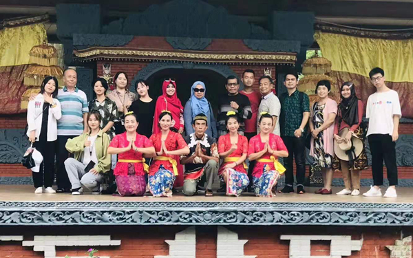 达赫兰大学校长一行来访期间,特意抽时间在我院东语系主任郭艳萍教授、印尼外教阿里夫夫妇以及2018级印尼语专业学生的陪同下赴印尼语专业实习基地----兴隆巴厘村参观,了解学生的实习情况,对充满印尼文化氛围的巴厘村赞不绝口,鼓励学生好好实习,为去印尼留学打好基础。