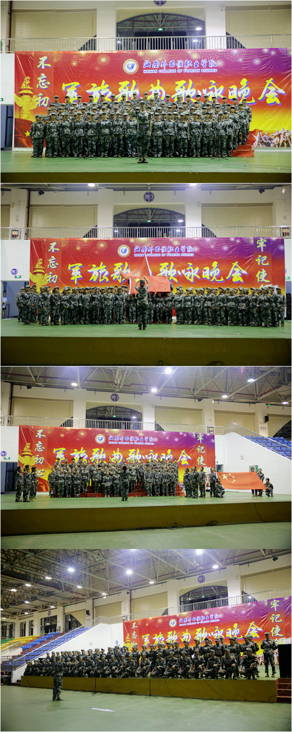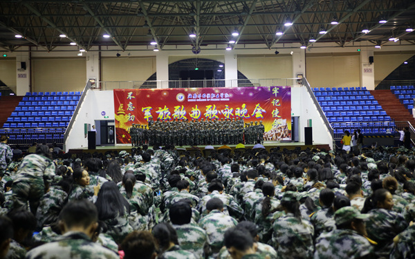 整顿戎装,戴正军帽,学生们昂首挺拔,依次有序地登上舞台。他们咏唱了《强军战歌》、《歌唱祖国》、《打靶归来》等曲目。他们挥舞着国旗,用年轻人特有的青春昂扬、用豪迈嘹亮的歌声演绎着歌曲,仿佛再现了革命先烈为国为家抛头颅洒热血时的奋勇景象。歌曲终了时,他们在不息的余音中高声齐喊出自己连队的口号——“军纪如铁,意志如钢,齐心协力,共铸辉煌”、“看我十八,昂首奋发,不惧烈日,坚韧不拔”……在高亢的口号声中,他们在那一刻仿佛接过了由先辈们递来的历史交接棒,这象征着在新中国腾飞壮大的今天,年轻人们将继续秉承着革命先辈们的无畏精神,不忘初心、牢记使命,在未来用自己的青春力量让伟大的祖国继续迸发无限的勃勃生机。