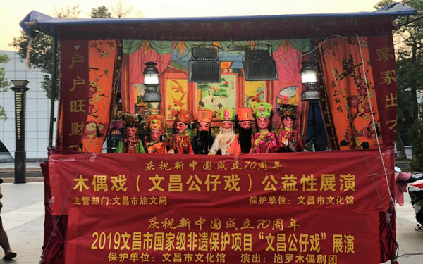 文昌公仔戏又称木偶戏、傀儡戏或手托木头戏,是海南省具有地方特色的传统戏曲表演艺术品种之一,为群众所喜闻乐见。以海南方言、民歌、民间器乐曲演化成唱腔,融入海南人的思想意识和生活习俗,演绎历史故事和本地民间故事。于2008年入选第二批国家级非物质文化遗产目录。