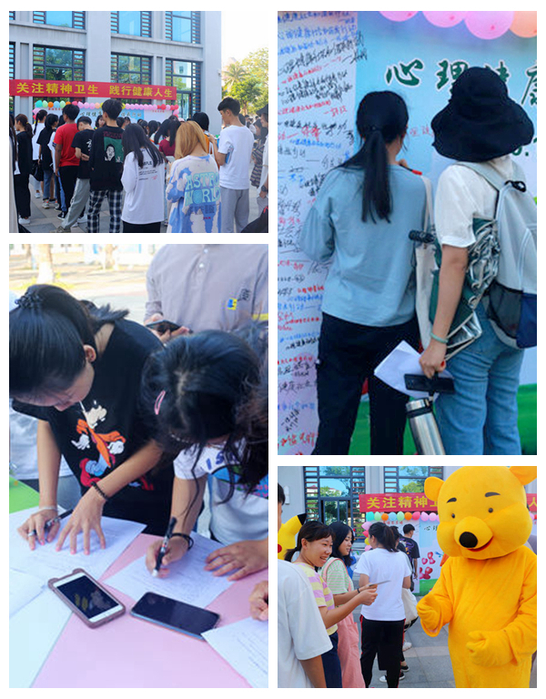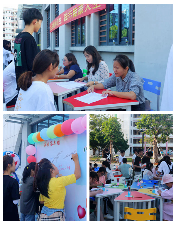 此次活动包括承诺签名、心理测试和咨询、制作心理健康主题画、心理知识小问答等。活动现场,同学们有的在承诺签名墙签字,领取心理健康知识手册;有的在心理老师的引导下进行心理测试,并聆听心理老师做出的咨询诊断;有的画一幅心理健康的主题画,运用绘画疗法使学生在创作的过程中体验心理健康的意义,提高学生关注自我心理健康的意识;还有的参与心理知识小问答,在一问一答中更好地学习和了解心理健康知识。