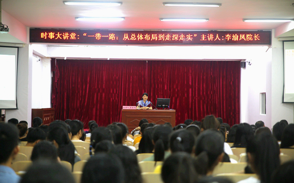 “‘一带一路’建设,作为承载新时代习近平总书记提出的‘构建人类命运共同体’使命的世纪工程,掀开了中国和世界发展进程的新一页。作为外语类高校的青年大学生,你们每个人都应该肩负起自己的使命,认真思考自己能够为‘一带一路’做些什么。”11月14日下午,我院图书馆多功能报告厅内不时传出阵阵掌声。我院李渝凤院长走进《形势与政策》课堂,以《“一带一路”:从总体布局到走深走实》为题,围绕何为“一带一路”、“一带一路”取得的主要成果、“一带一路”倡议深入人心的原因、“一带一路”与教育对外开放以及学院在参与“一带一路”建设中的实践等方面,为同学们讲授了一场别开生面的时事专题课。