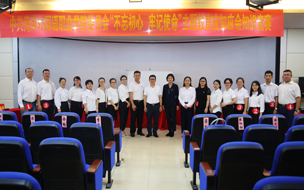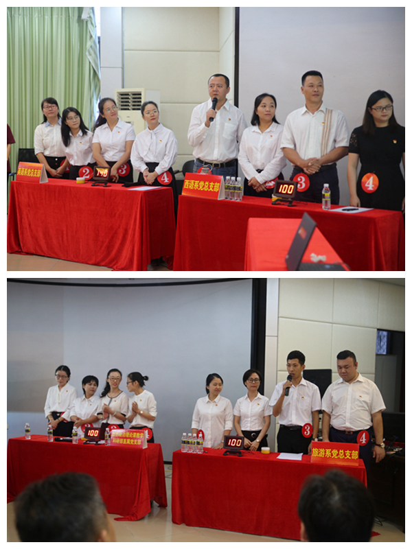 学院党委书记曾锋,党委副书记、纪委书记徐畅,党委委员梁松亲临现场,与各基层党组织党员一同观看了决赛,并分别为获奖队伍颁奖。经过前一阶段的初赛,英语系党总支部、西语系党总支部、旅游系党总支部、思想政治理论课教学科研部直属党支部等四支参赛队伍脱颖而出,进入决赛。