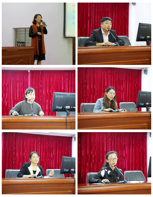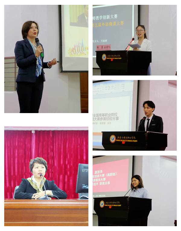 交流会上,六位教师及两位学生分别代表微课团队、英语口语团队、旅游酒店技能大赛团队、日语技能大赛团队、俄语技能大赛团队、教学能力比赛团队分别进行了竞赛经验交流展示。随后,英语系英语教育教研室郑一新老师、国际商务系国际贸易教研室夏冰老师和毛泽东思想和中国特色社会主义理论体系概论教研室赵佳钰老师分别代表2018-2019学年度优秀教研室进行从教学组织管理、专业建设、课程建设、师资队伍建设、教学研究、科研项目等方面进行工作经验交流。