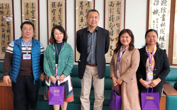 台湾明道大学汪大永校长(左三)、国际事务处国际长萧雅柏(左一)与我院英语系老师合影