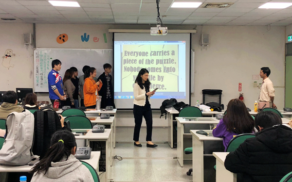 在接下来的三天里,双方代表一边排练英语话剧《Christmas Carol》,一边体验中教的《中英笔译》、《文法与句型》和外教的《声调节奏与口语练习》、《口语演讲指导》等课程的课堂教学。我院学生很快融入了大班课堂学习中,与台湾明道大学的同学充分互动、积极合作,尽情享受着课堂学习氛围,也充分展示了我院学子思维敏捷、活跃大方、敢于表达的精神风貌。