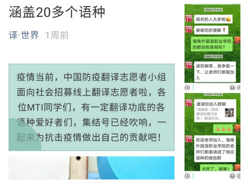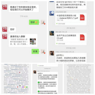 得知消息后,各语种专业教师纷纷扫码添加,但是由于全国申请加入的志愿者人数过多,系统一直显示“添加次数过多,不能添加”。为了能够尽快加入进去,为抗击疫情工作多做贡献,各系部负责人主动与中国防疫翻译志愿者小组负责人联系沟通,最终各语种教师得以加入,并根据不同语种分配到不同的工作群中,由此开启了老师们不一样的“宅家”生活。