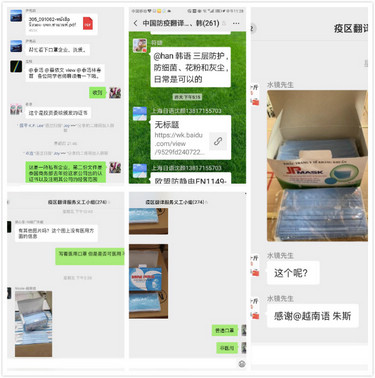 “能帮忙翻译下上面的文件吗”“帮忙看下口罩企业、资质”“各位老师麻烦翻译一下”……中国防疫翻译群里,这样的消息不断出现。“手机每天都响个不停。一听到响,身体就已经是条件反射般马上拿起来看,生怕错过任何一个翻译任务。即使只是一句话或一个名称的翻译,也希望能够出自己的一份力。”越南语专业教师朱斯说道。身为党员的她就在多个防疫翻译群里开展志愿服务。