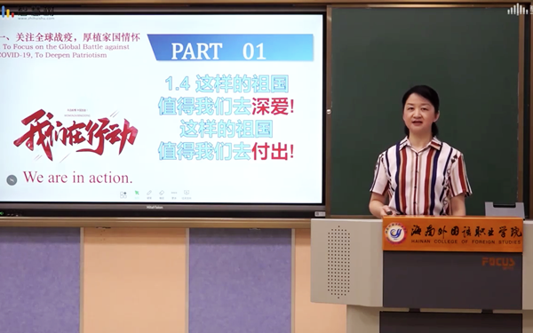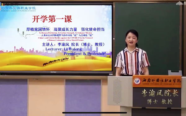 “共同战疫让我们不断成长,我们是否也应该在疫情面前积极思考?我们应当养成敬畏生命、积极主动、明辨是非、涵养美德、惜时如金、坚持自律、学会合作、心怀使命的品质。作为当代青年,我们也应该去思考如何进一步增强社会公民意识,厚植家国情怀,增长国际视野。”李院长一边向大家提问,一边引导同学们积极思考每个人在抗疫斗争中的所思所悟所行所获。随后,她与同学们分享了习近平总书记给北京大学援鄂医疗队“90后”党员的回信,告诉大家青年一代必须“有理想、有本领、有担当”。同时,她还向全体师生介绍了学院将始终以“立德树人”为根本任务,以建成应用型本科高校为目标,以服务国家“一带一路”倡议和海南自贸港建设为己任,致力于培养“厚植家国情怀、具有国际视野、跨文化交际能力、扎实专业基础的高素质应用型外语人才”的使命与担当。
