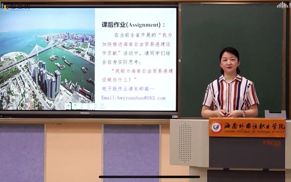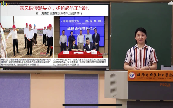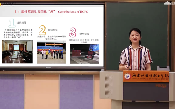 为了让同学们更好地理解“停课不停学”,李院长还为大家介绍了我院教师是如何开展线上教学的。一张张熟悉、认真的正在开展线上教学的中、外籍教师面孔出现在屏幕之中。李院长指出,全院教师都十分认真的开展线上教学,并积极将我们身边的抗疫知识、故事融入了教学之中,同时还在多语种课程教学中融入了“课程思政”内容。学院还专门运用“智慧树”平台组织全体学生参加《旅行发热与病毒》、《灾难心理学及灾后心理救援》这两门课程和省教育厅指定的《海南省高等学校2020年春季开学健康教育--科学认知新冠肺炎众志成城共抗疫情》课程的学习。李院长还介绍,截至3月24日统计,疫情期间我院在线课程(含活动)共计开设333门课程,参与学生157653人次,参与教师近367名,几乎涵盖了学院98.3%的课程。《海南日报》也对学院“线上教学抓效果,空中课堂提质量”进行了专题的报道,充分地肯定了学院在“停课不停学”期间的高质量教学成效。