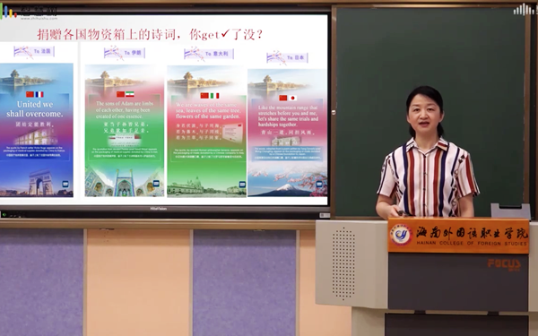 在授课最后一部分,李渝凤院长从学院抗疫工作的组织领导,到全院师生共同抗疫,再到我院学生在全国各地为抗疫积极行动出发,深情地与大家回顾了全院师生及学院理事会成员凝聚爱心共捐款24.3万余元用于采购海南文昌等本地瓜菜驰援湖北的动人情景,并分享了学院师生“以译抗疫”的优秀事迹等等,告诉同学们我们都在以海外院人独有的方式为抗“疫”做贡献,扛起属于海外院人的使命与担当。