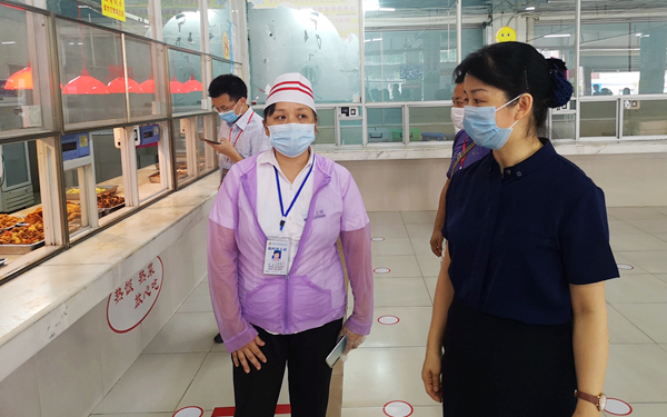 在学院食堂,看到同学们主动间隔一米排队打饭,李院长非常满意。她向食堂工作人员询问了食堂整体供餐情况,对食堂规范管理提出了建议和要求。要求食堂工作人员注重配菜的营养健康,让同学们吃得安全、吃得健康。李院长还与自带饭盒打包带走就餐的英语教育专业学生亲切交谈,仔细询问学生对食堂菜肴的建议,叮嘱学生加强营养,并鼓励学生努力学习,提升英语口语水平,毕业后为海南自贸港建设和海南省公民外语水平提升贡献力量。