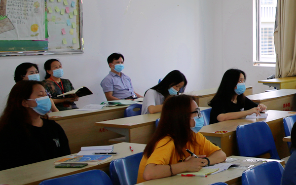 当天上午,杨学前副院长也走进英语系杨丹老师的“复学第一课”课堂。他一边听老师讲课,一边认真做笔记,并十分关注课堂师生互动和学生听课情况。课后,他与授课老师进行了交谈,表示对师生们能够迅速进入新学期工作及学习状态表示满意,叮嘱老师们要多关注和关心学生,做好学生心理疏导,尽量把语言学习和防疫知识相结合,丰富学生专业活动。
