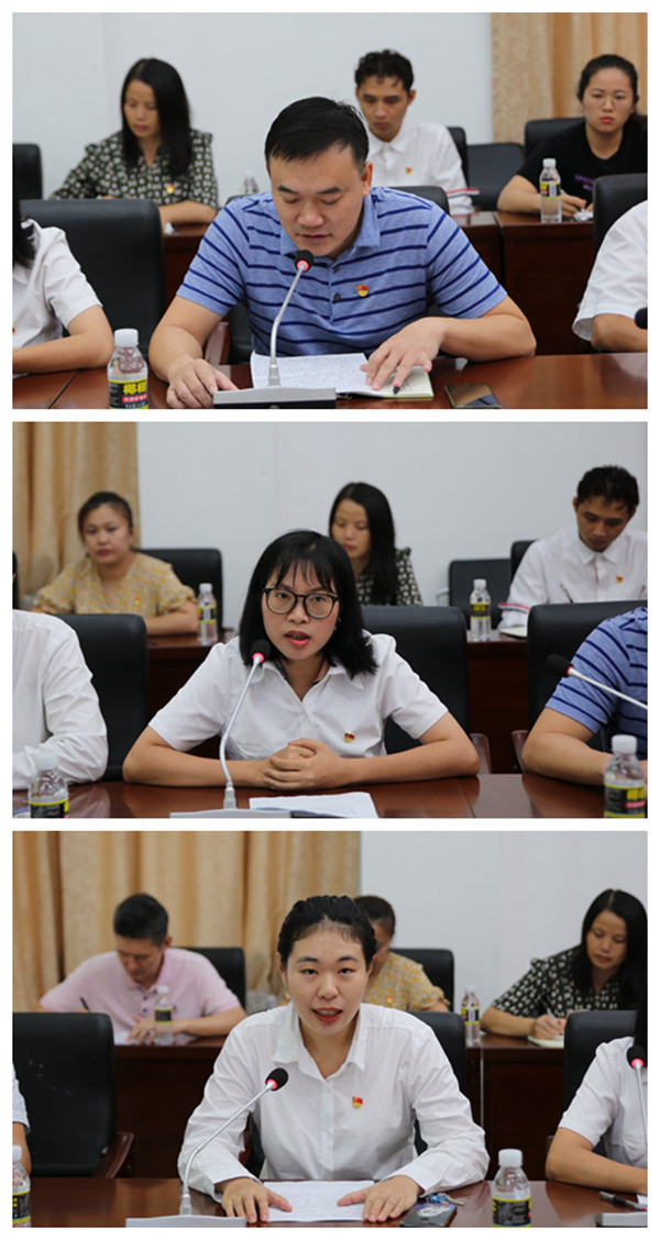 随后,英语系党总支部副书记吴清晖、旅游系教师党员冼洁丹、西语系学生党员田芸菡先后作交流发言。