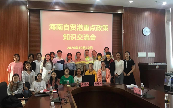 为推进学院广大师生们更好地学习海南自由贸易港建设总体方案的要求,致力服务建设海南自由贸易港,10月10日下午,我院特邀省委政研室决策咨询处处长陈珂,副处长段勇兵,干部黄绿云、王新莅临我院开展“海南自贸港重点政策知识交流会”,交流会分两个会场。院长李渝凤、党委副书记黄丽芹、副院长杨学前、副院长梁松出席交流会。各部门主要负责人,系部书记、主任,各党支部书记,各教研室主任,国际交流中心人员等五十余人在会场一参加交流会,会议由党委副书记黄丽芹主持。学院学生处干部、学生党员和入党积极分子在会场二参加交流会,会议由学生处处长主持。