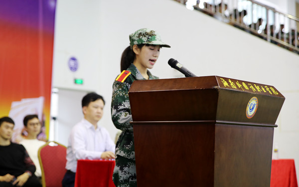 来自人文艺术系2020级语文教育1班的新生代表谢卓琪同学上台发言,对承训单位的领导、学院领导以及教官们致以崇高的敬意和感谢。她表示这次军训培养了我们的爱国主义和集体主义精神,强化了我们的国防意识,磨练了我们坚强的意志,铸造了我们艰苦奋斗的精神。她呼吁各位同学继续发扬一不怕苦二不怕累的精神,严格遵守学院的各项规章制度,努力学习专业知识和职业技能,不断提高我们的综合素质,为建设更加强大的祖国、为学院的腾飞发展、为实现我们的大学梦想继续努力。