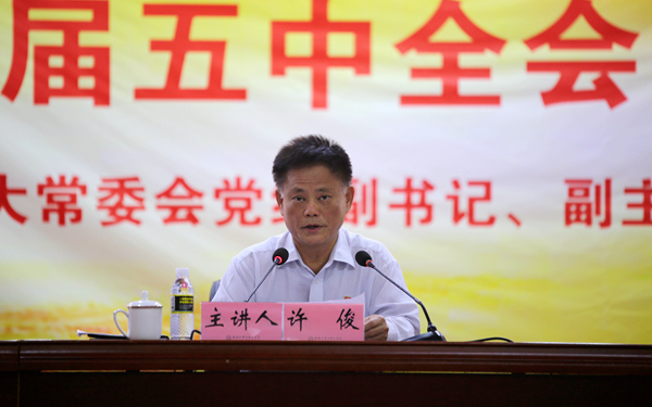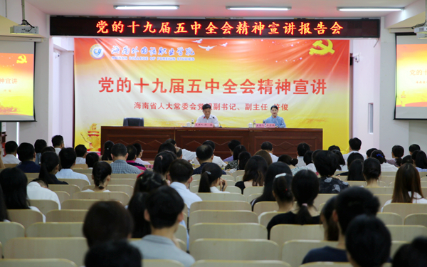 在全省上下深入宣讲贯彻党的十九届五中全会精神,全面推进海南自贸港建设之际,11月19日下午,省委宣讲团成员、省人大常委会党组副书记、副主任许俊莅临我院宣讲党的十九届五中全会精神。省人大常委会研究室主任陈彤,文昌市人大常委会副主任黄良锐等同志陪同。宣讲会由我院院长李渝凤教授主持。全体在校的学院领导出席宣讲会,全体副科级以上干部、党务工作者、思政课教师、师生党员、入党积极分子聆听了宣讲。