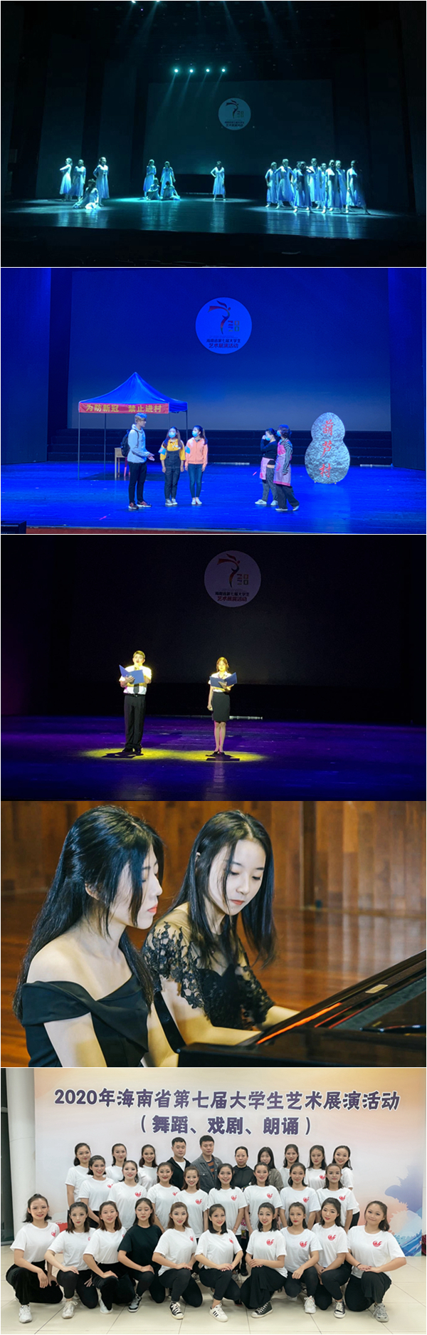海南省第七届大学生艺术展演活动由海南省教育厅主办、海南省艺术教育促进会协办,旨在深入学习贯彻习近平总书记关于教育的重要论述和全国教育大会精神,切实落实《国务院办公厅关于全面加强和改进学校美育工作的意见》《教育部关于切实加强新时代高等学校美育工作的意见》,展示我省高等学校艺术教育的成果。本届展演活动紧紧围绕“奋斗•创新•奉献”的时代主题,分为学校选拔、省级集中展演、全国现场展演三个阶段,全程历时一年半。来自全省19所高等院校的约3500余名师生参与了全省集中展演,在声乐类、舞蹈类、器乐类、戏剧朗诵类、大学生艺术实践工作坊类五大赛事项目上展开角逐。12月1日至3日,开展了本届展演活动参赛视频作品线上直播评审工作和高校美育改革创新优秀案例线下评审工作。